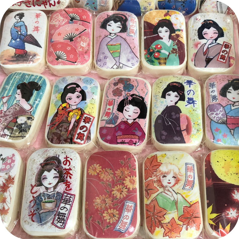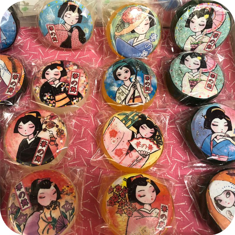 熱海芸妓見番グッズ 華の舞観覧記念に・熱海土産にもどうぞ 熱海芸妓公認キャラクター「まめっこグッズ」はこちらから!! ☚ 熱海芸妓集によるオリジナルデコレーションソープ 踊りや季節毎に絵柄が変わりますのでぜひお楽しみください。 手作り美肌石けん 1P 500円(税込) 手作りお身体石けん 1P 400円(税込)3P 1000円(税込)
